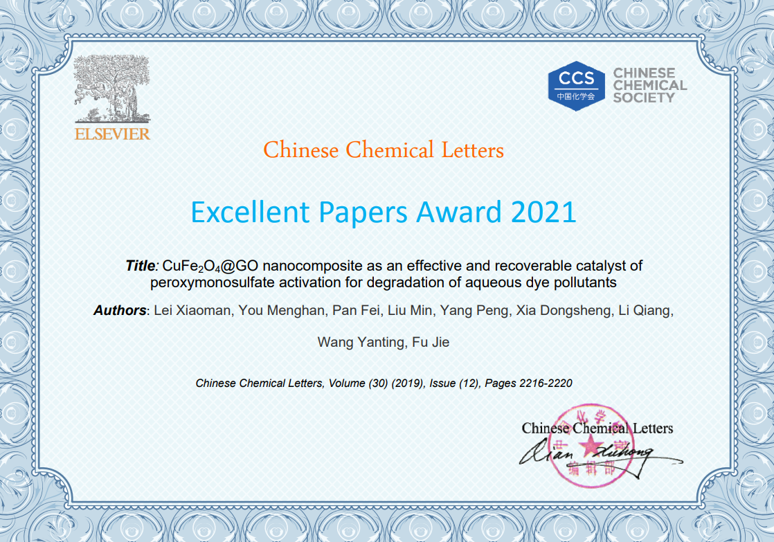 近日,环境工程学院毕业硕士研究生雷晓曼在校期间发表的题为“CuFe2O4@GO nanocomposite as an effective and recoverable catalyst of peroxymonosulfate activation for degradation of aqueous dye pollutants(Chinese Chemical Letters 30 (2019) 2216-2220)”的文章荣获Chinese Chemical Letters Excellent Papers Award 2021。