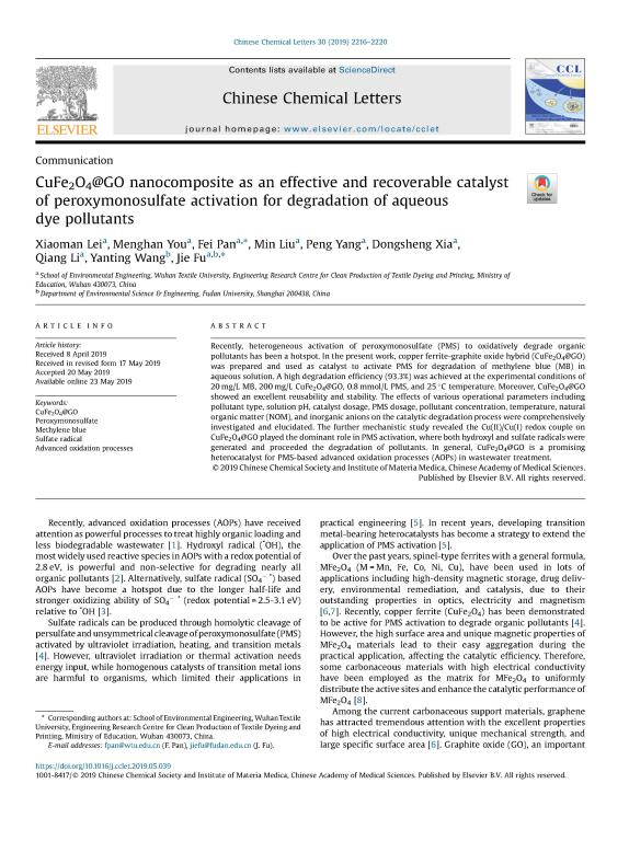 该研究采用一步式溶胶-凝胶燃烧法成功制备出具有磁性的复合材料CuFe2O4@GO,亚甲基蓝(MB)作为降解污染物;研究结果表明:在CuFe2O4@GO + PMS体系中,加入氧化剂PMS反应30min后,MB的去除率为93.4%。该材料具有磁性便于回收利用,经过5次循环重复实验MB的去除率为81.1%,且离子溶出较少。自由基淬灭实验和EPR测试表明CuFe2O4@GO +PMS降解MB体系中的活性自由基为SO4·-和·OH,且SO4·-起到主要作用;从CuFe2O4@GO反应前后的XPS测试结果可以看出,CuFe2O4@GO中的铁离子在反应前后的价态未发生改变,而铜离子在反应过程中存在价态的变化,即Cu2+-Cu3+-Cu+之间的氧化还原反应,这也是该体系PMS被活化的主要机制。该论文以雷火电竞官网环境工程学院为第一完成单位,雷晓曼同学为第一作者,潘飞老师为通讯作者。