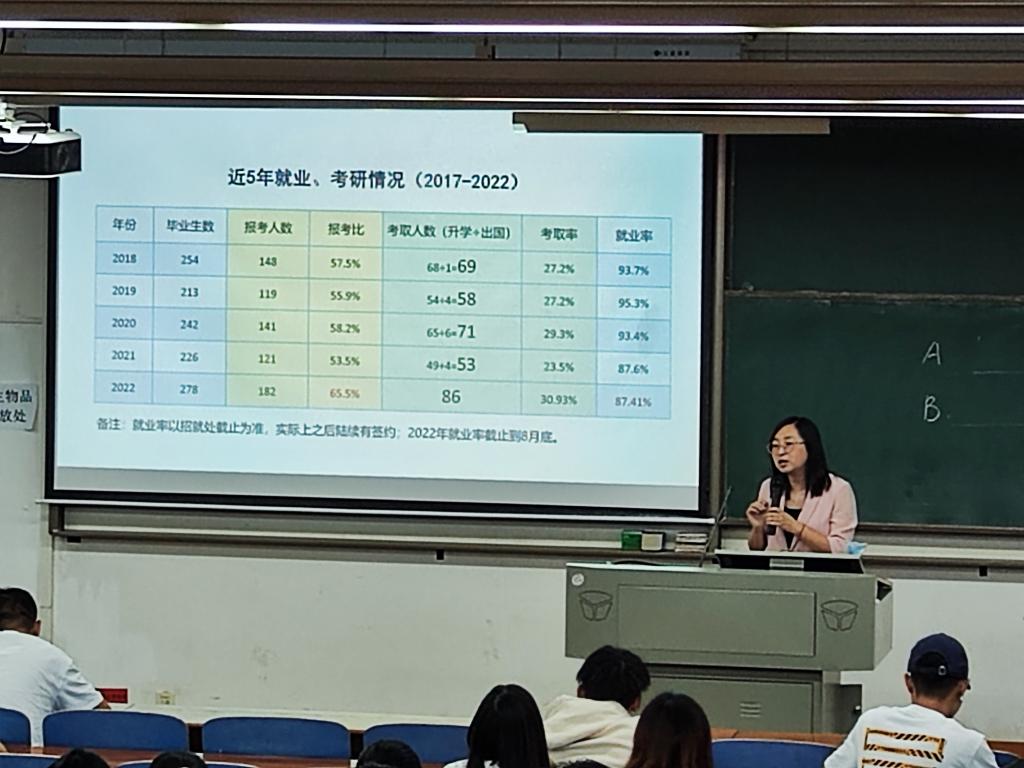 姚瑶以学院近5年的考研就业数据为同学们分析了当前就业考研形势,并分析了“逆向考研”、“缩招”等就业热象背后的原因,建议同学们认清形势、全面准备、主动出击、抱团成长,为大学四年划上圆满的句号。