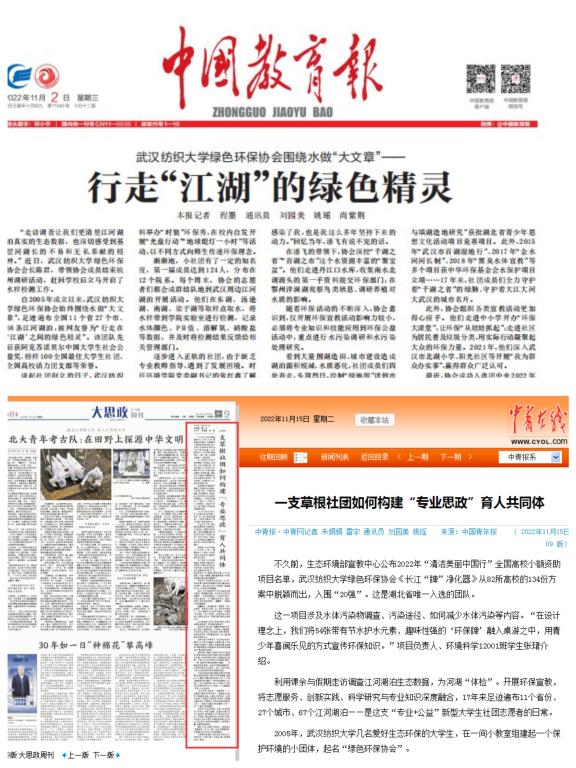 国家级媒体聚焦学院生态实践育人成效,外宣报道25篇。中国教育报以《行走“江湖”的绿色精灵-雷火电竞官网绿色环保协会围绕水做“大文章”》,中国青年报以《一支草根社团如何构建“专业思政”育人共同体》,中国青年网以《用青春守护长江:雷火电竞官网师生助力“长江大保护”》为题,报道学院思政协同育人模式;新增省级青年环境友好使者9人,省级长江大保护宣传员4人,省级社会实践优秀项目1项,武汉市最佳志愿服务项目1项,绿色环保协会荣获学校首届“五星”社团称号。